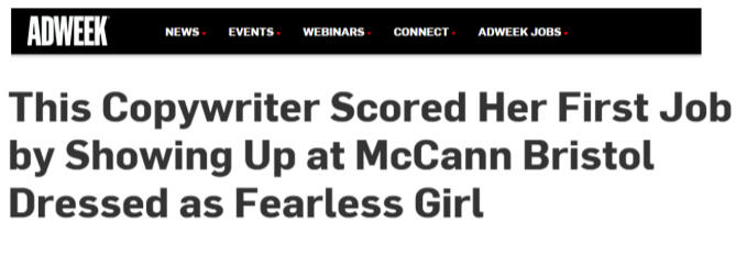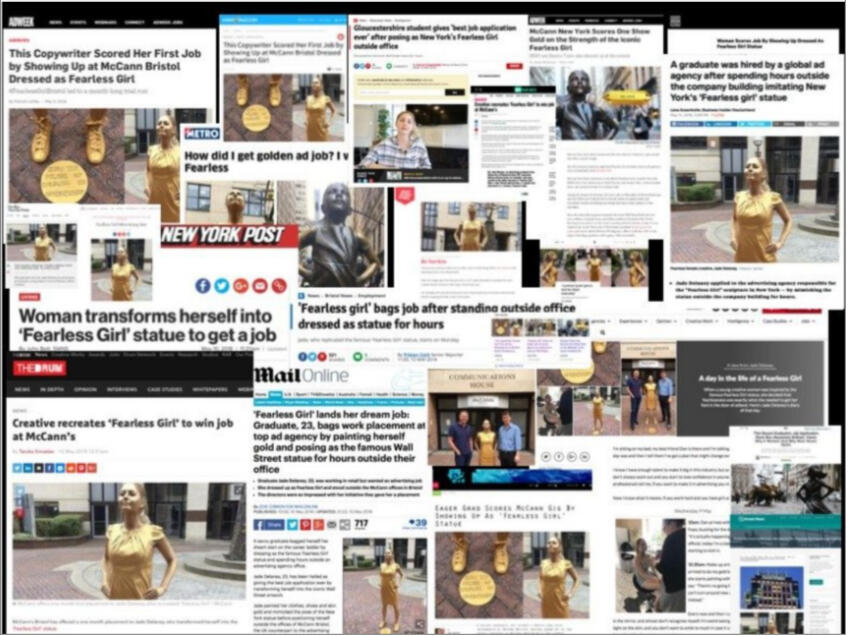 Fearless Girl was a campaign put on by the advertising agency McCann.She was intended to send a message about workplace gender diversity.She was installed in March 2017 on Broadway across from the Charging Bull sculpture.Jade Delaney has entered the chat.A copywriting intern that brought Fearless Girl to Life as part of her application to McCann.