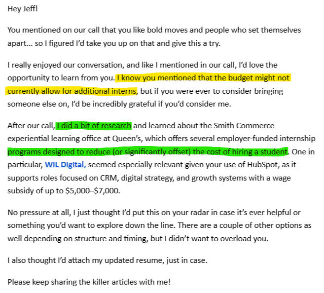 Low agency students think they are "just a student".High agency thinkers ask Perplexity what problems a business likely has and what potential solutions may exist.Then they approach those companies with their research and ideas.If you want to earn a full on coffee date, then think about how you can bring something to them they haven't been thinking about.Like this email from a Queen's student.She learned I spent my budget already on summer students, so she found a program that would pay for her salary.That's high agency.