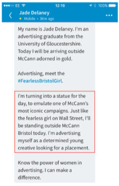 Fearless Girl was a campaign put on by the advertising agency McCann.She was intended to send a message about workplace gender diversity.She was installed in March 2017 on Broadway across from the Charging Bull sculpture.Jade Delaney has entered the chat.A copywriting intern that brought Fearless Girl to Life as part of her application to McCann.